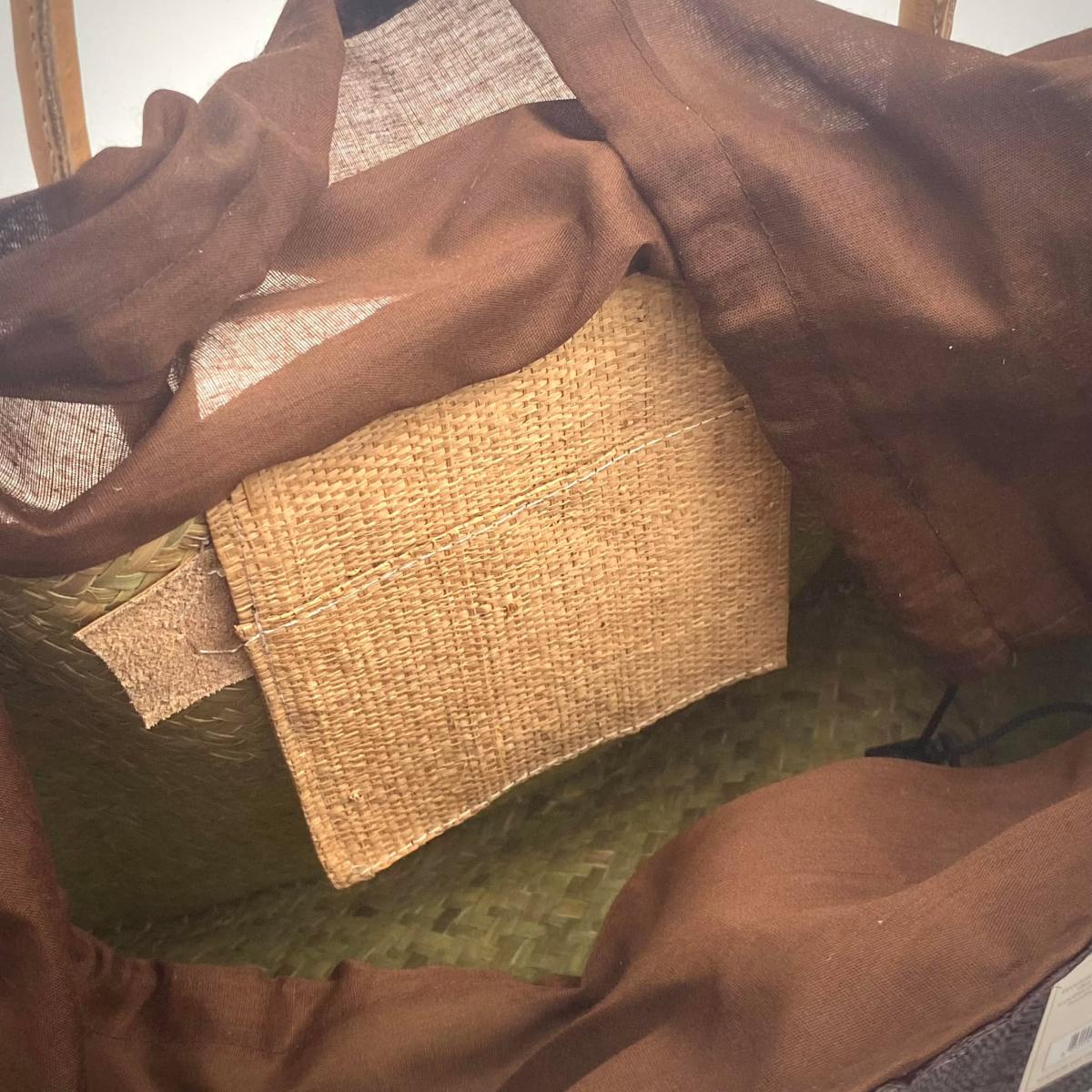 Shopping bag with drawstring closure and small raffia pocket inside. Leather-reinforced corners and handles.