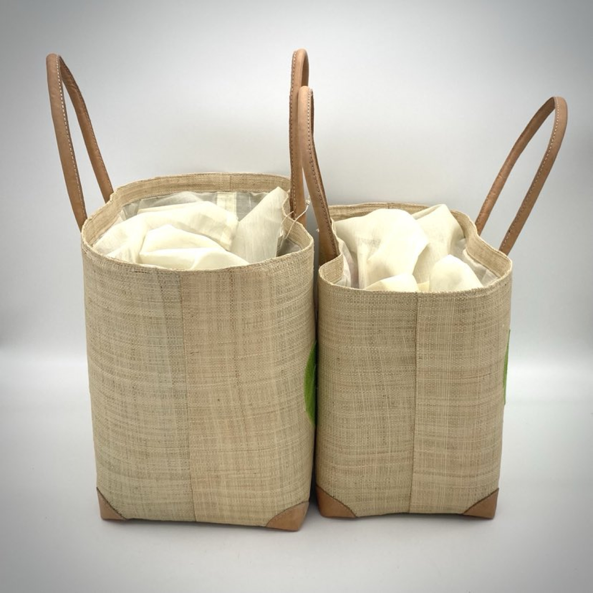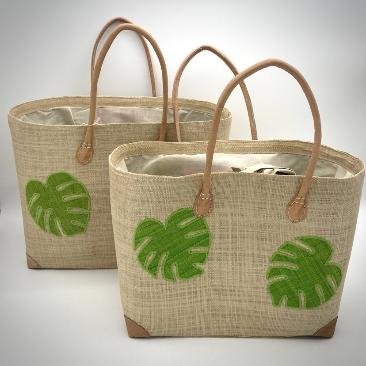 A beige raffia bag with a chic, natural style and a touch of colour (green leaf) to add vibrancy.