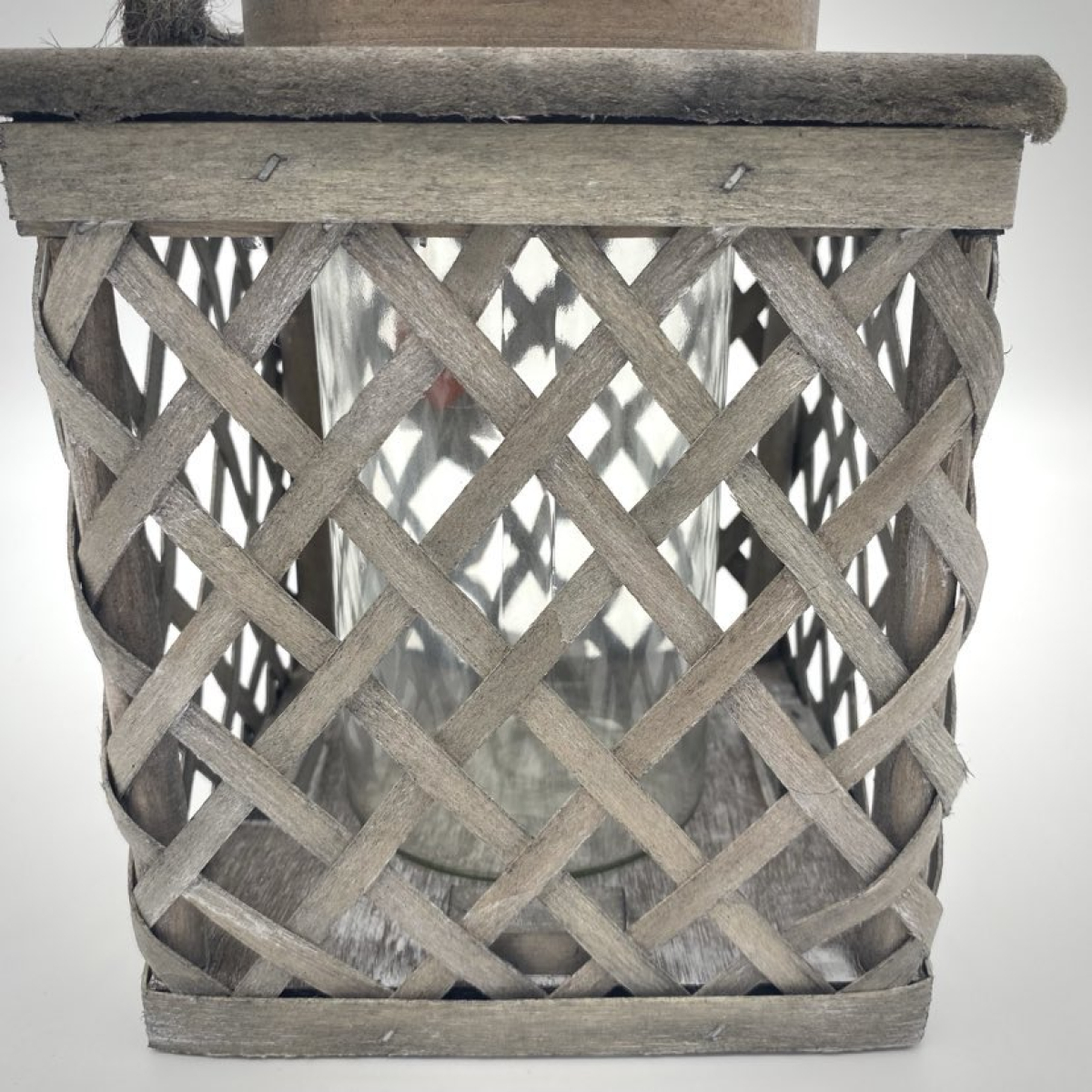 Pretty decorative lantern in grey ceruse chipboard, with a glass insert and hanging cord.