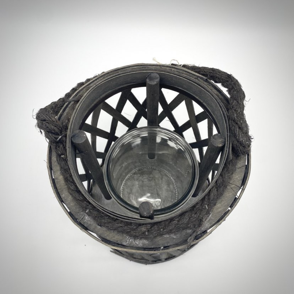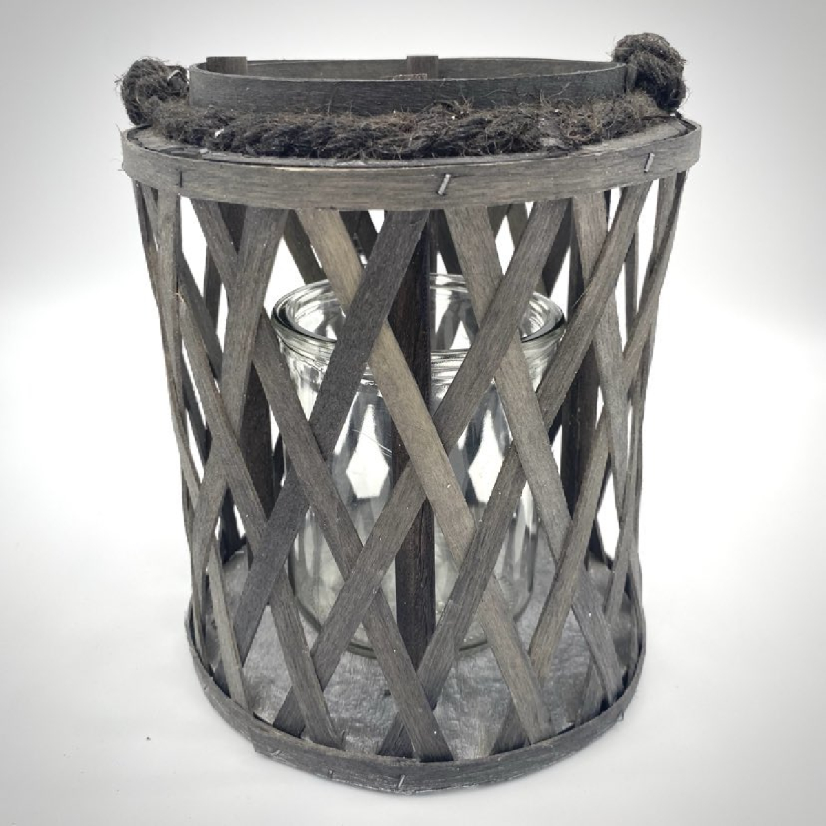 Pretty decorative lantern in grey ceruse chipboard, with a glass insert and hanging cord.
