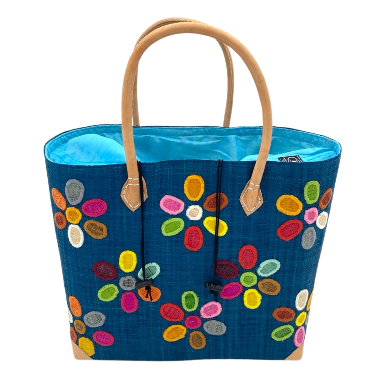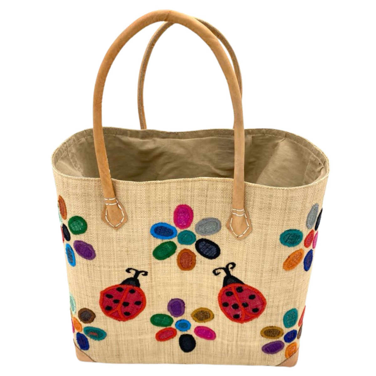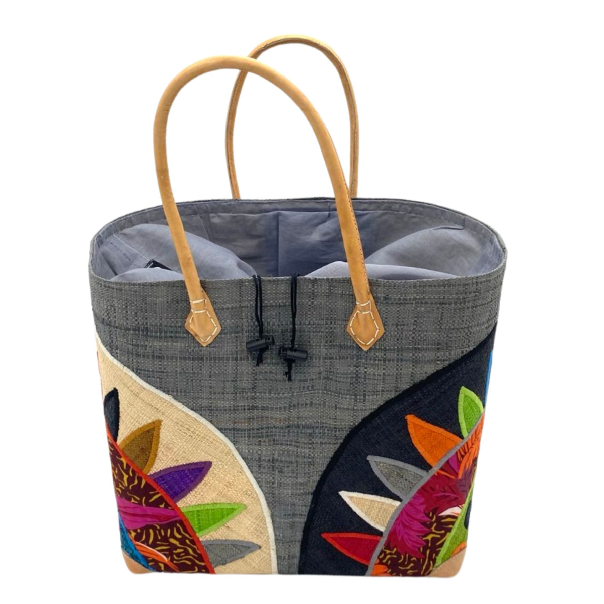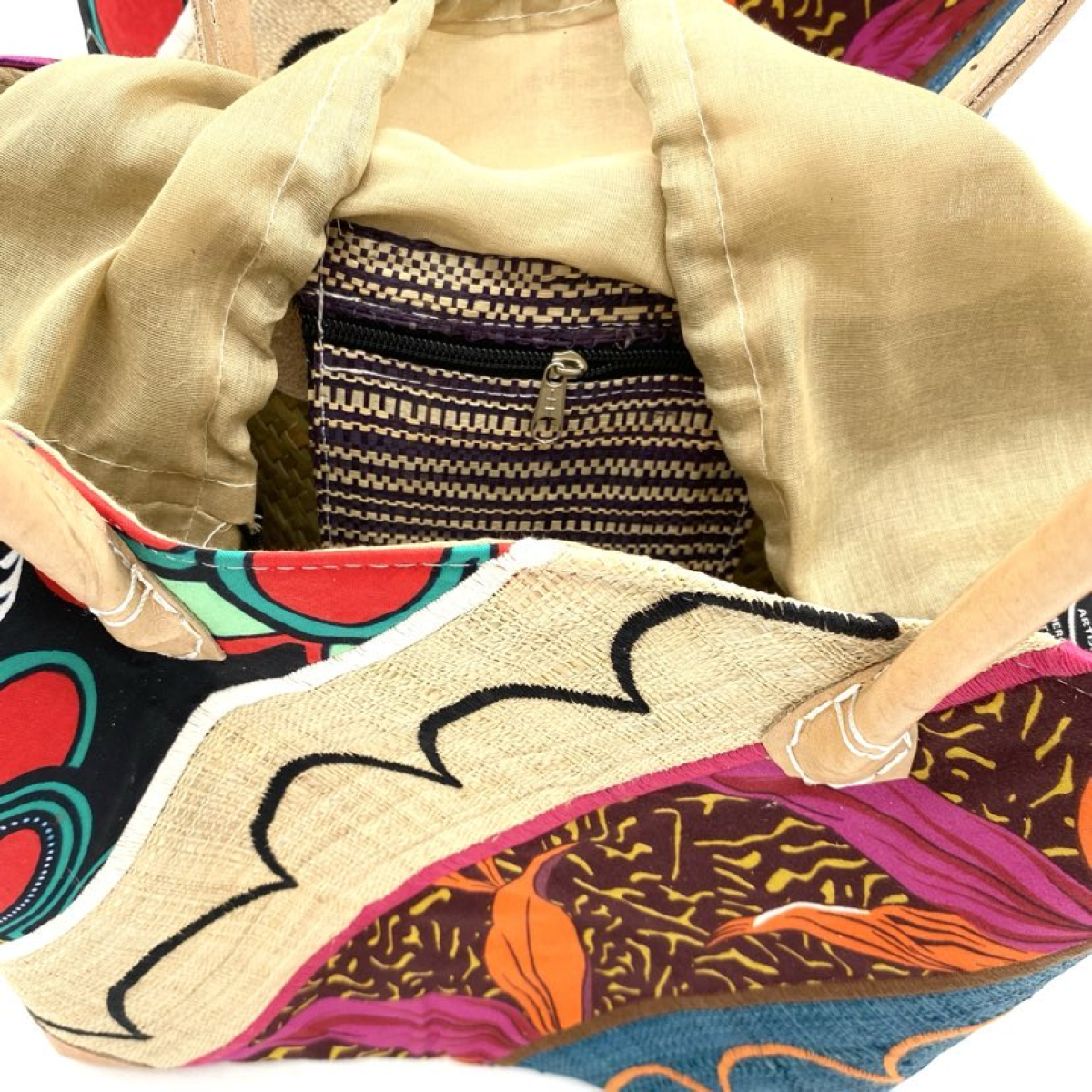 Sac cabas unique est entièrement confectionné en raphia naturel, avec des motifs brodés à la main, apportant une touche artisanale et authentique.