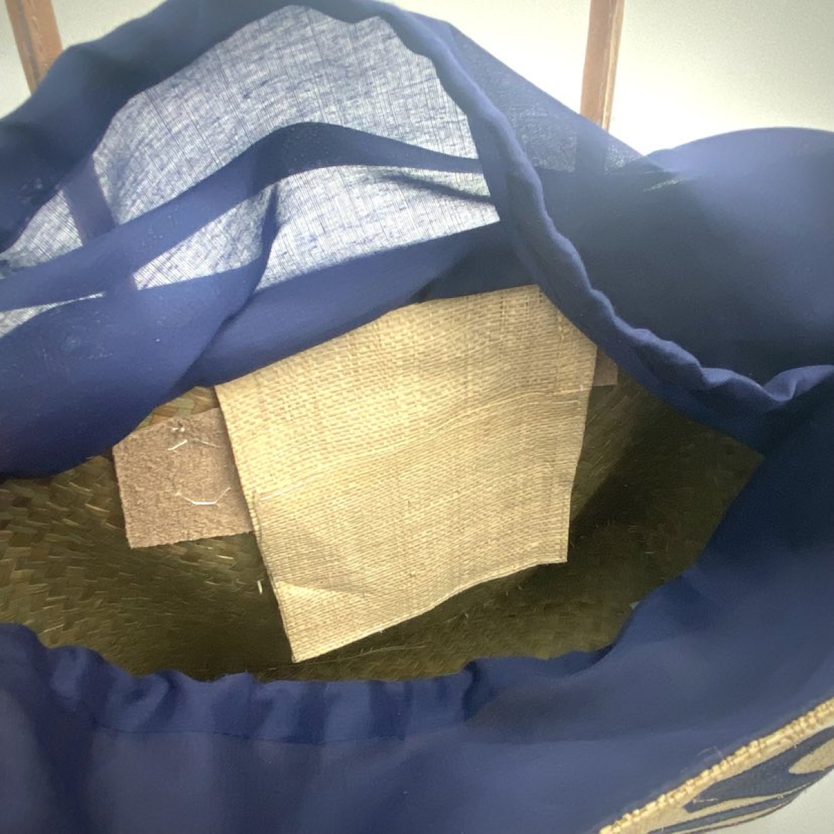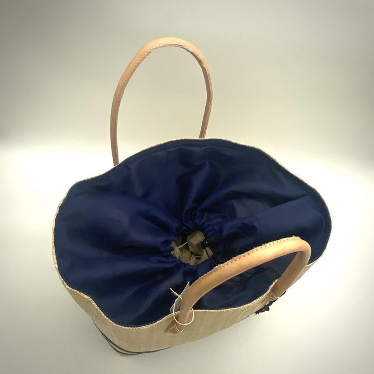 Il possède une poche en raphia à l'interieur, et son système de fermeture est un cordon à serrer.