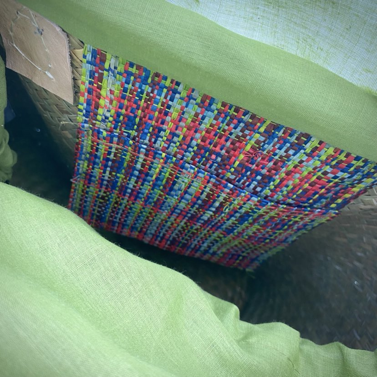 Il possède une poche en raphia à l'interieur, et son système de fermeture est un cordon à serrer.
