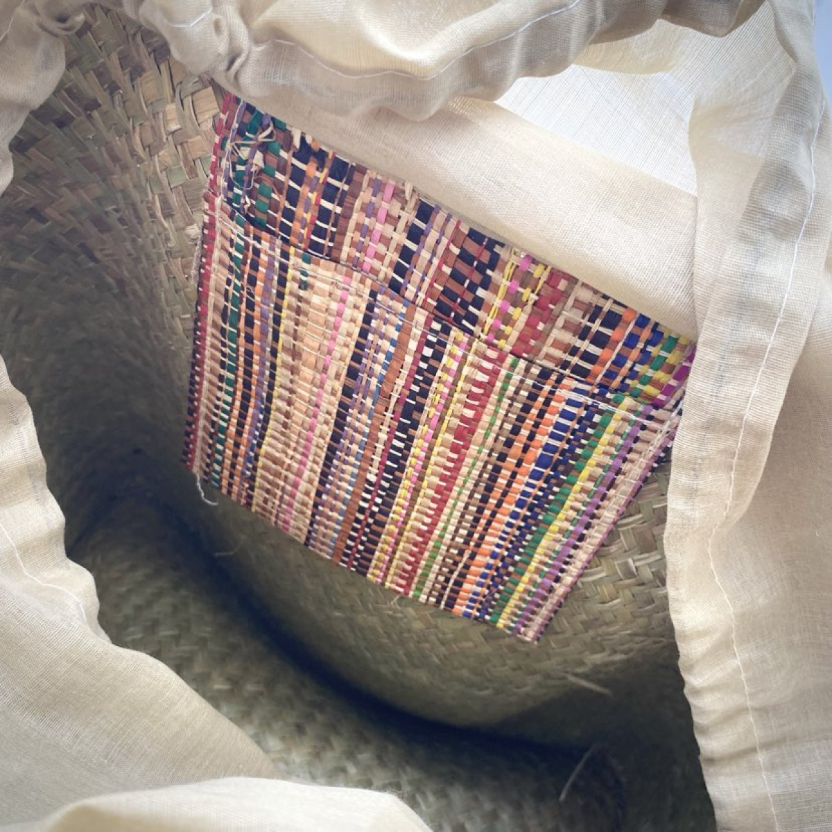 Il possède une poche en raphia à l'interieur, et son système de fermeture est un cordon à serrer.