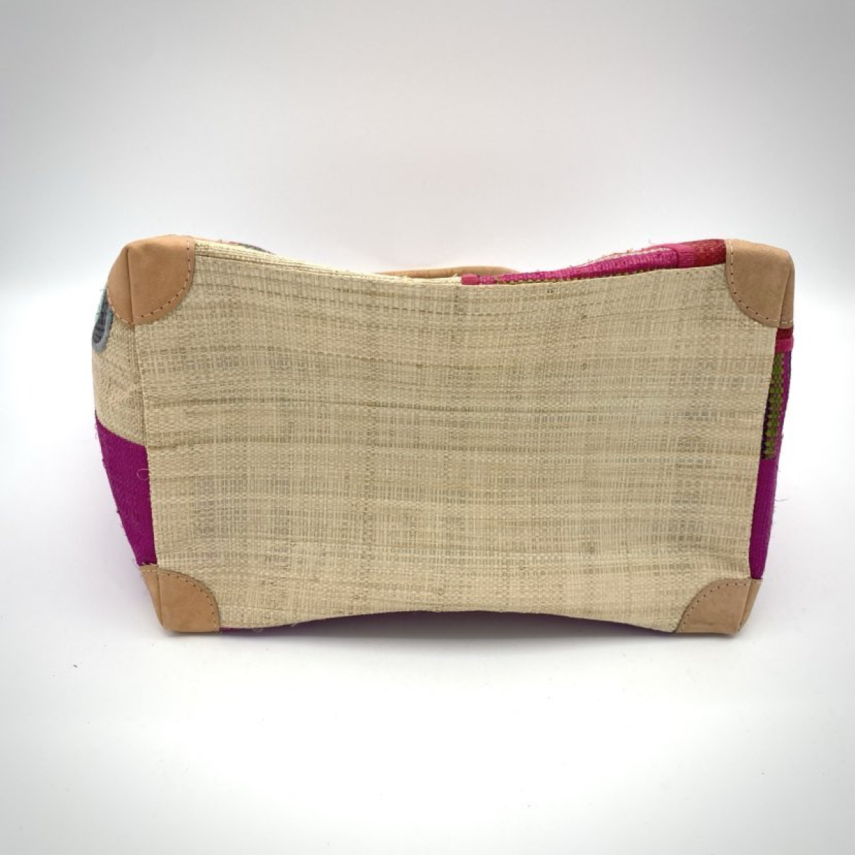 Ce cabas raffiné combine l'élégance du raphia ou rabane avec des motifs "patchwork" colorés.