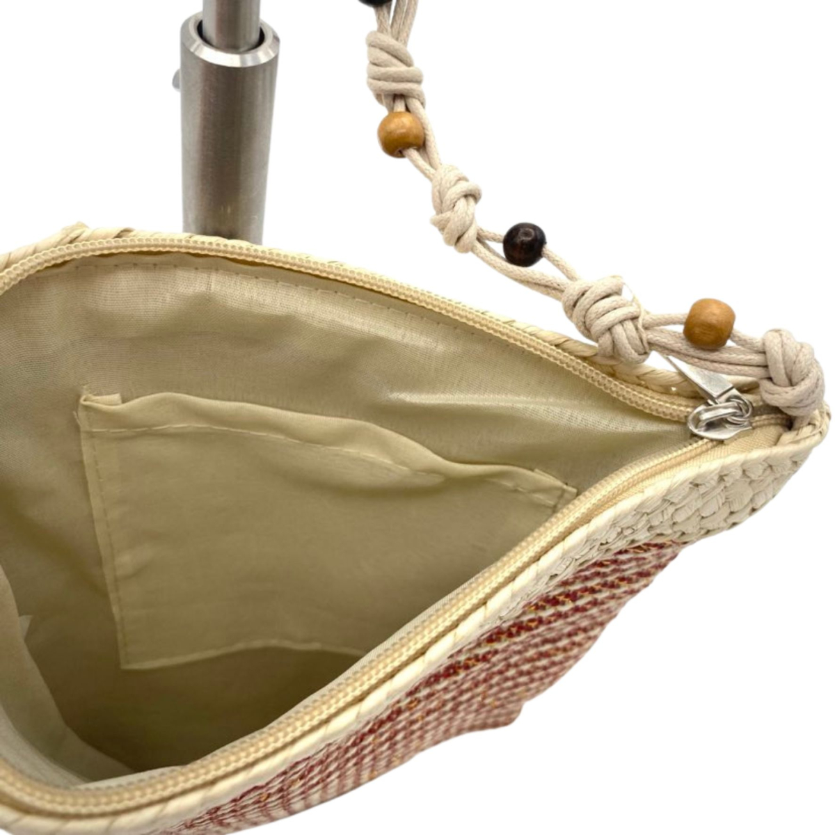 La longue anse en tissu avec des perles en bois ajoute un côté boho et artisanal au sac, créant un joli contraste avec la corde tissée.