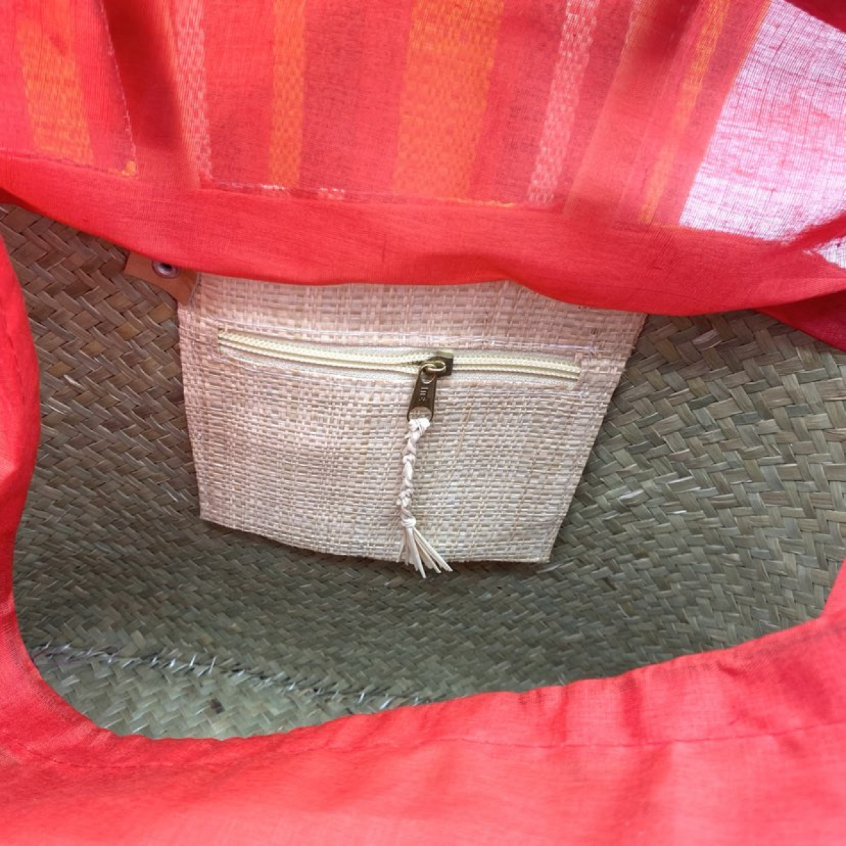 Une petite poche intérieure en raphia, dotée d’une fermeture éclair, permet de ranger vos essentiels en toute discrétion.