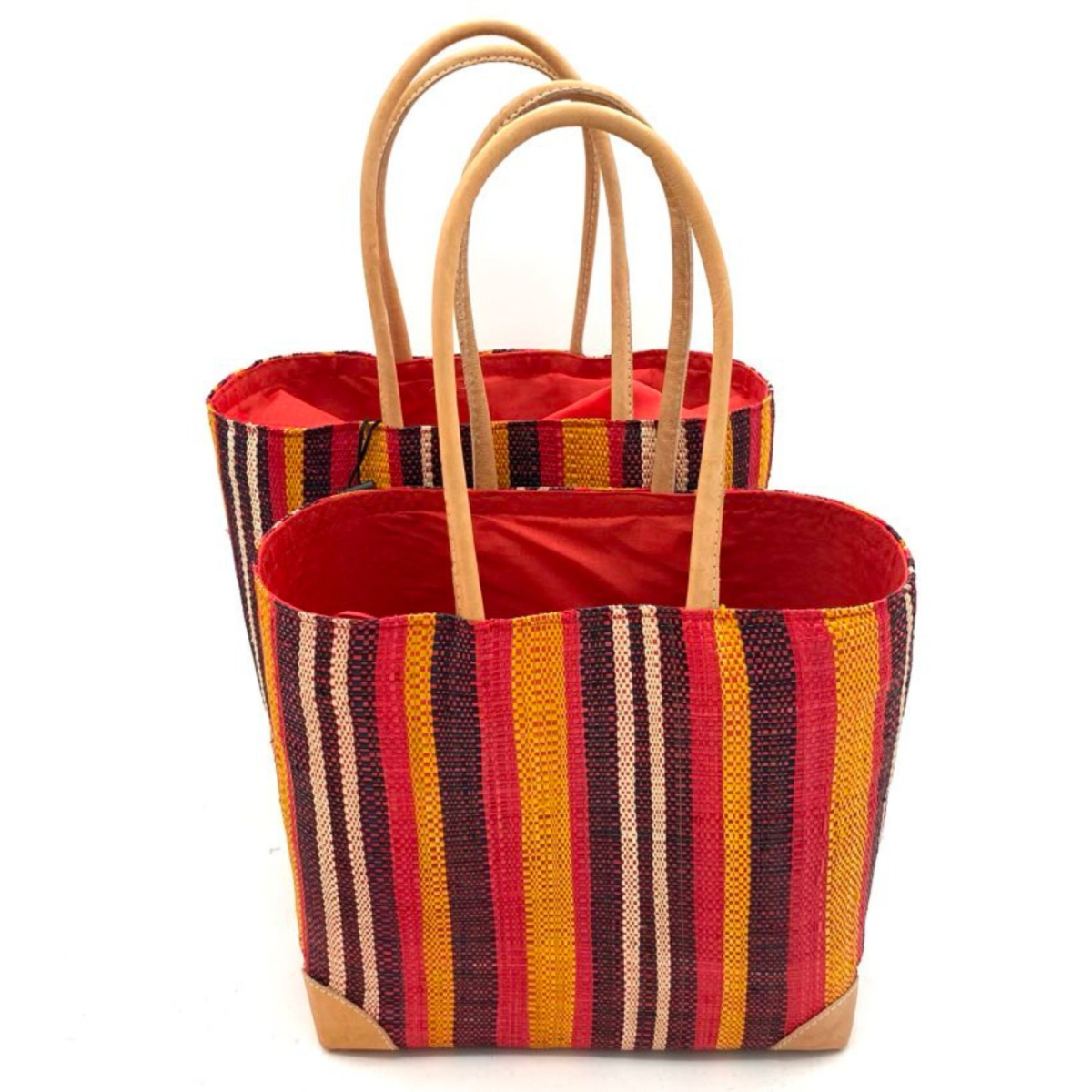 Sac cabas unique est entièrement confectionné en raphia naturel, avec des motifs rayés multicolores dans les tons rouge, apportant une touche artisanale et authentique.