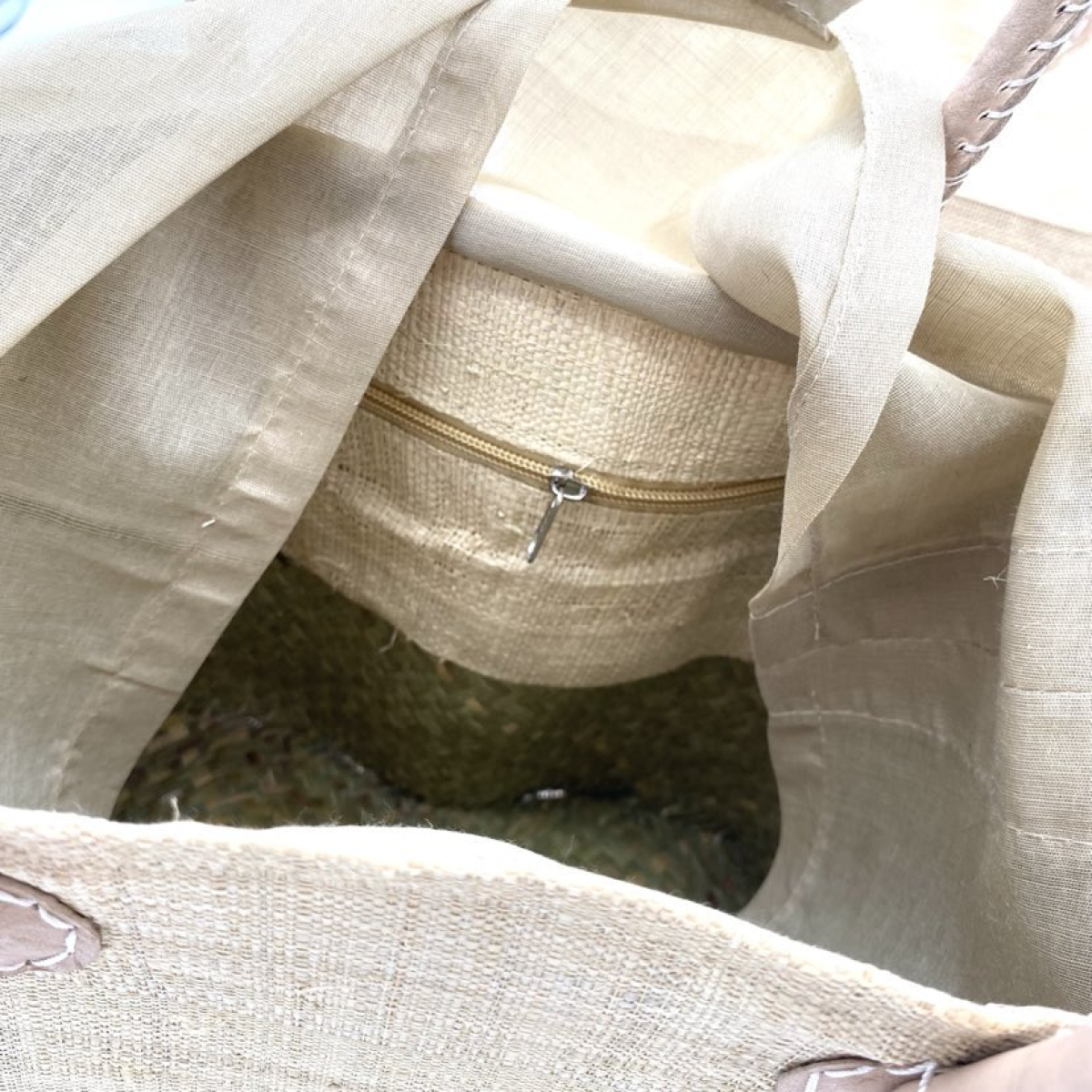 Une petite poche intérieure en raphia, dotée d’une fermeture éclair, permet de ranger vos essentiels en toute discrétion.