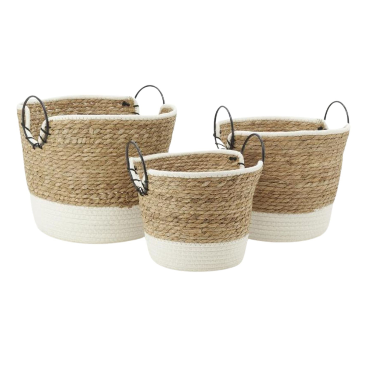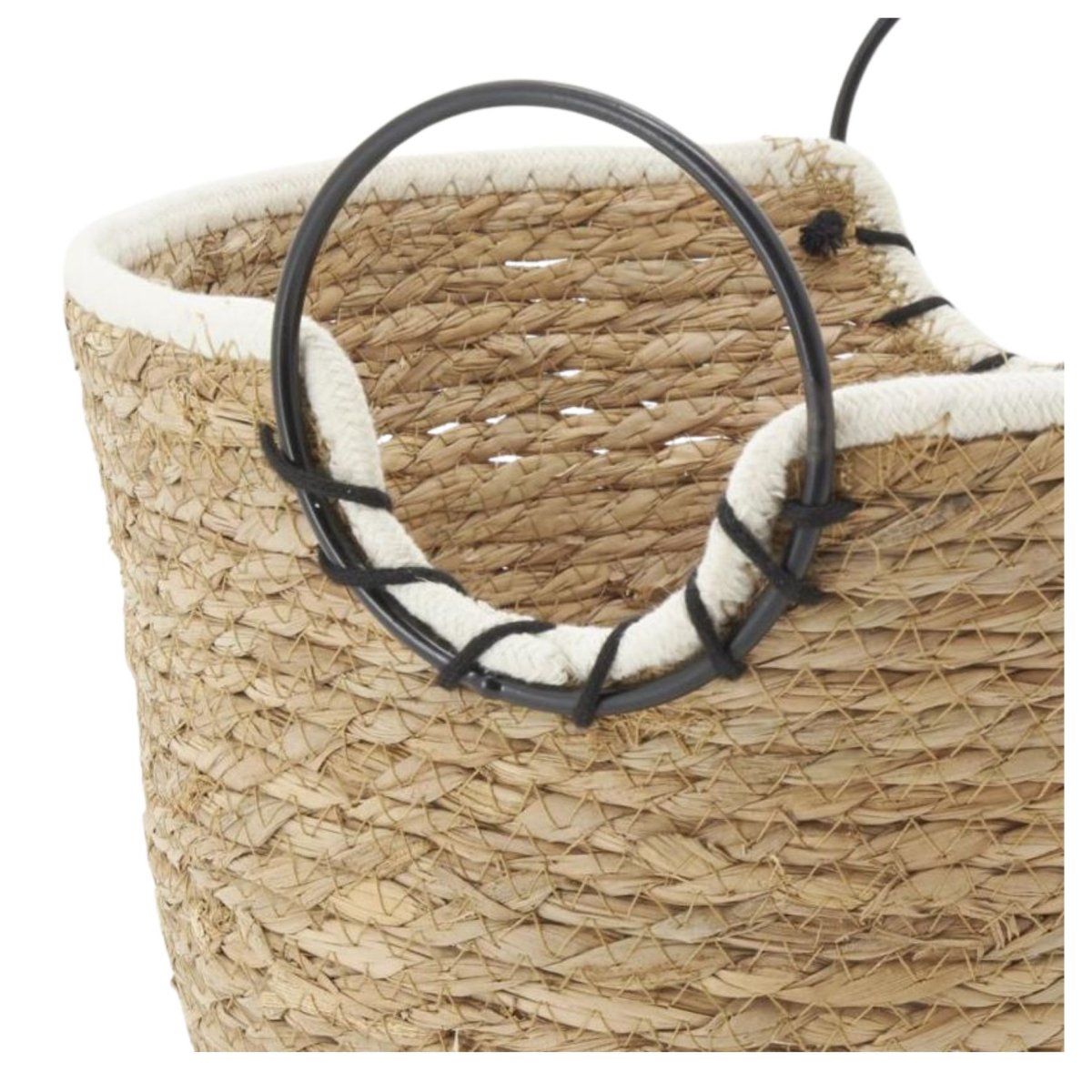 Ajoutez une touche d’élégance naturelle à vos espaces de rangement avec ces corbeilles en jonc tressé et coton, rehaussées de poignées en anneau métal noir.