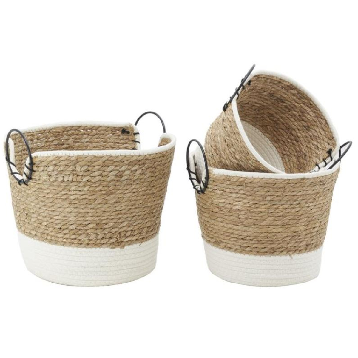 Ajoutez une touche d’élégance naturelle à vos espaces de rangement avec ces corbeilles en jonc tressé et coton, rehaussées de poignées en anneau métal noir.